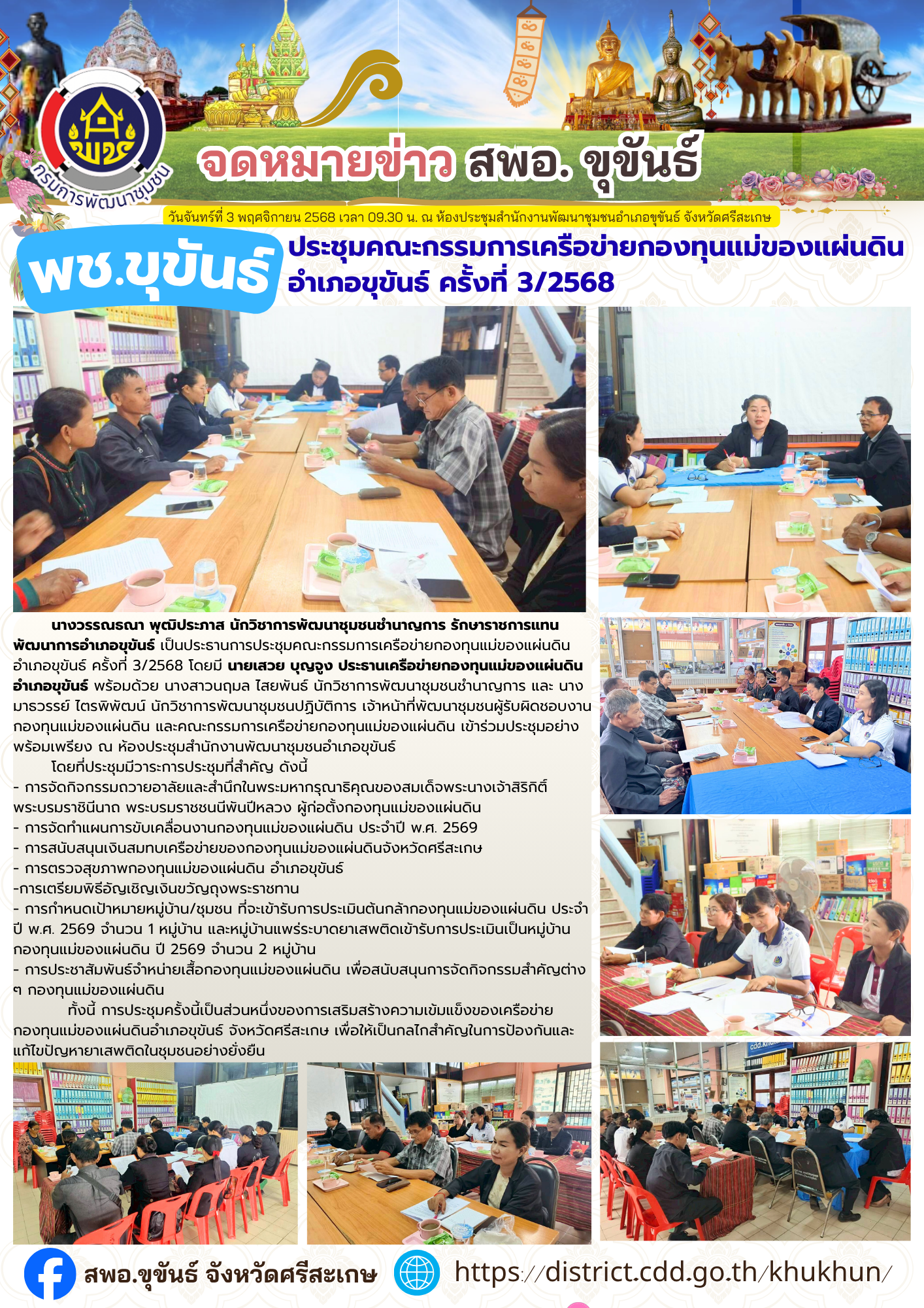 วันจันทร์ที่ 3 พฤศจิกายน 2568 เวลา 09.30 น. ณ ห้องประชุมสำนักงานพัฒนาชุมชนอำเภอขุขันธ์ จังหวัดศรีสะเกษ