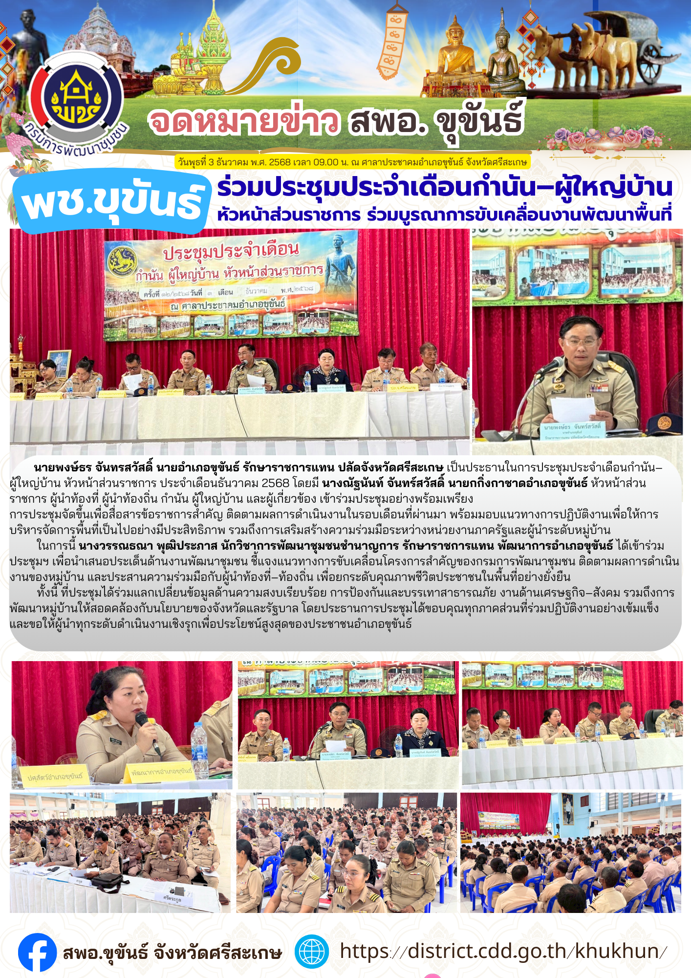 นายพงษ์ธร จันทรสวัสดิ์ นายอำเภอขุขันธ์ รักษาราชการแทน ปลัดจังหวัดศรีสะเกษ เป็นประธานในการประชุมประจำเดือนกำนัน–ผู้ใหญ่บ้าน หัวหน้าส่วนราชการ ประจำเดือนธันวาคม 2568 โดยมี นางณัฐนันท์ จันทร์สวัสดิ์ นายกกิ่งกาชาดอำเภอขุขันธ์ หัวหน้าส่วนราชการ ผู้นำท้องที่ ผู้นำท้องถิ่น กำนัน ผู้ใหญ่บ้าน และผู้เกี่ยวข้อง เข้าร่วมประชุมอย่างพร้อมเพรียง